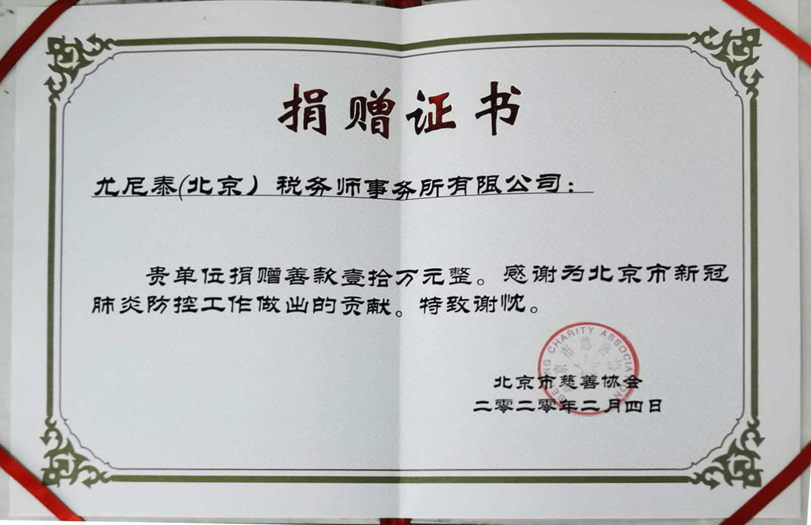 2020年2月,為北京市新冠肺炎疫情防控工作捐款10萬元。